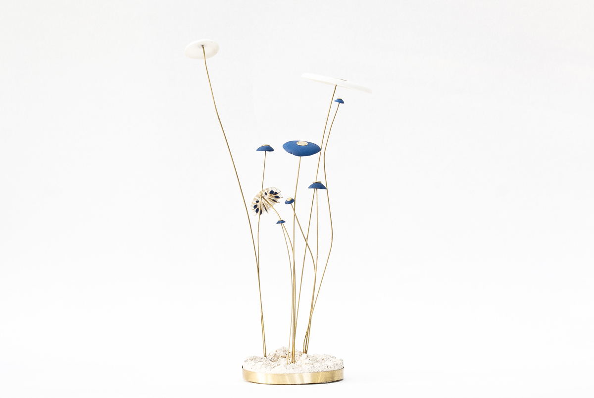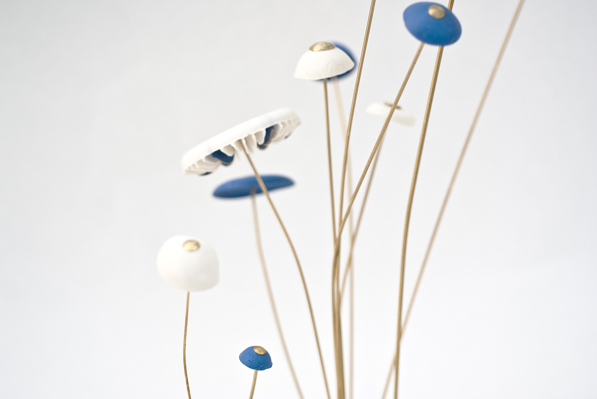 « Myceta Poetica VI » is composed of white porcelain and porcelain tinted in the mass with blue pigments. The edges of certain gills are covered with a fine layer of gold. The mushroom stems are made of brazed brass, then sanded and waxed. The mushrooms are mounted on a stoneware base encircled with brass.