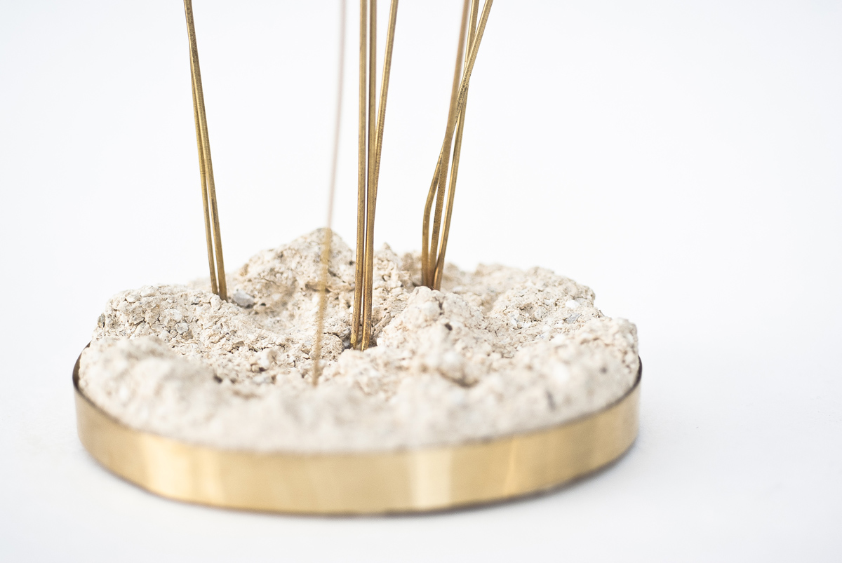 « Myceta Poetica VI » est composée de porcelaine blanche et teintée dans la masse avec des pigments bleus. La tranche de certaines lamelles est recouverte d’une fine couche d’or. Les pieds des champignons sont en laiton brasé , poncé puis ciré. Les champignons sont installés sur un pied en grès cerclé de laiton.
