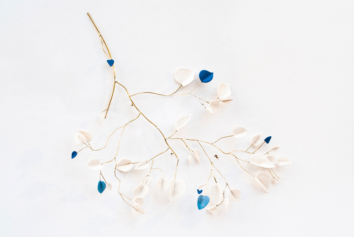 Les branches et feuilles en porcelaine, rehaussées de dorures et de laiton, font écho aux mycètes : la nature crée une infinité d’œuvres uniques et il n’existe pas deux feuilles ou branches identiques. La céramiste transforme une simple forme de cœur en feuilles toutes différentes et des tiges fines de laiton en variations uniques, qui mettent en lumière la beauté douce et inspirante de la nature.