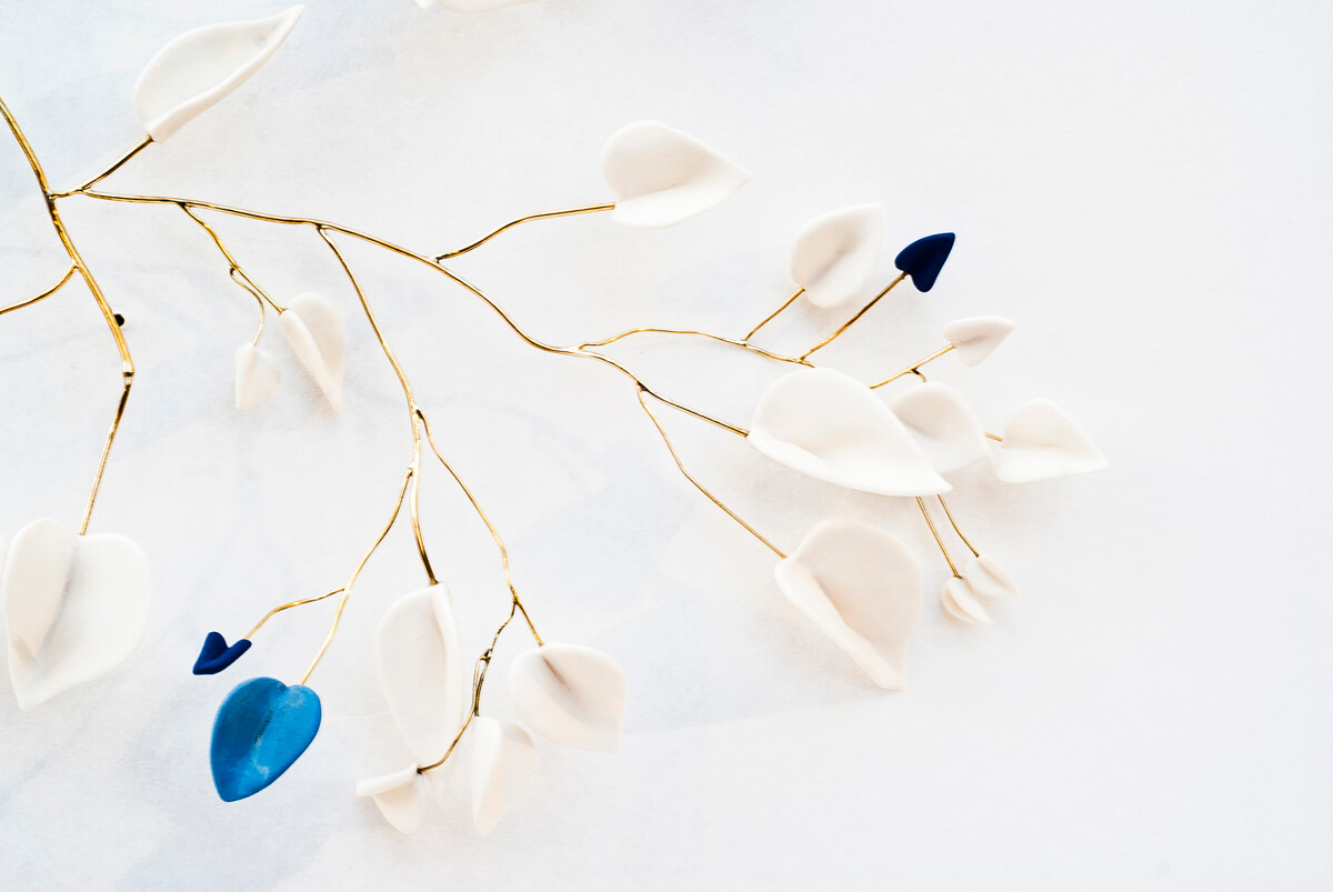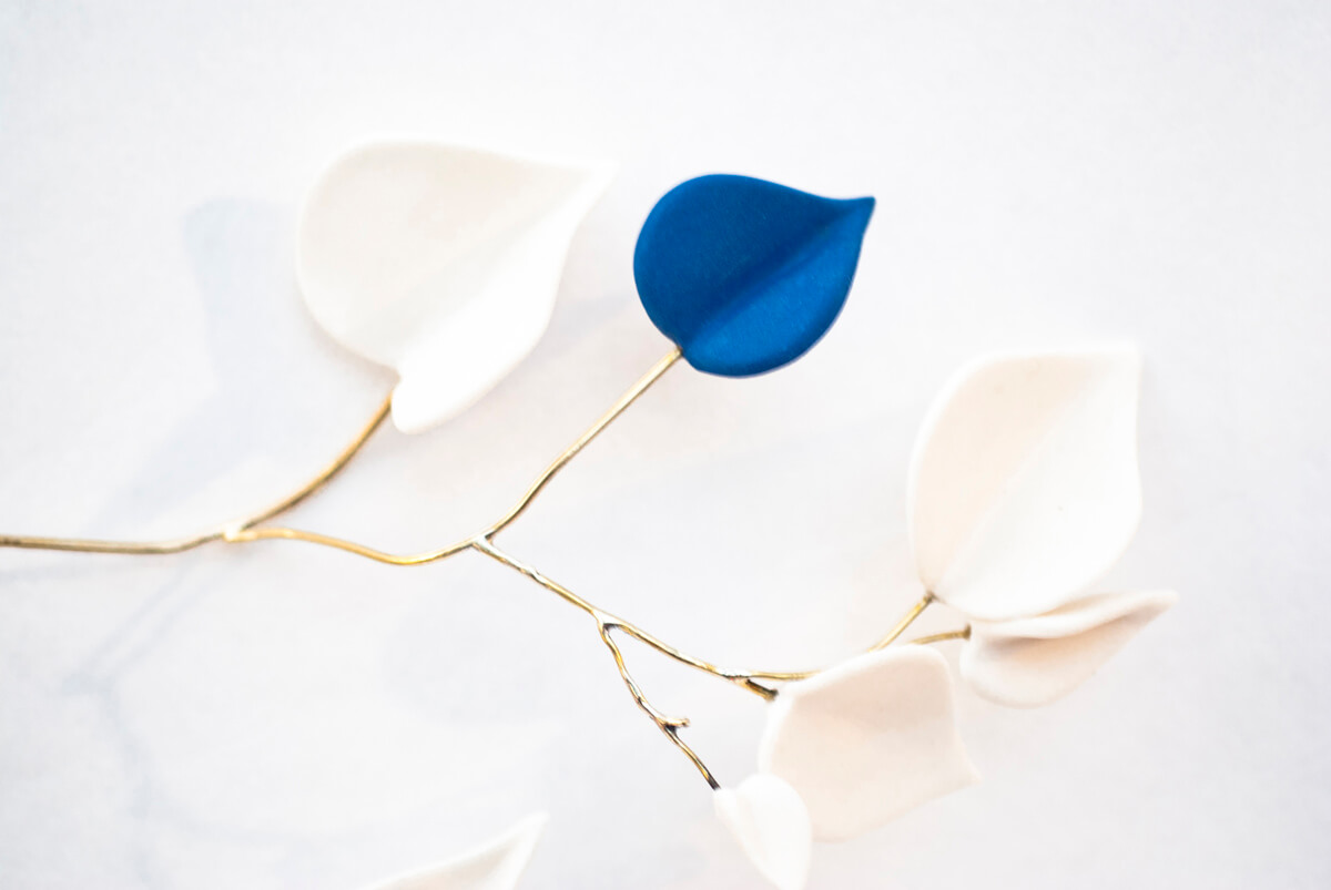 The porcelain branches and leaves, enhanced with gilding and brass, echo mycetes: nature creates an infinite number of unique works, and no two leaves or branches are ever identical. The ceramicist transforms a simple heart shape into leaves, each one different, and fine brass stems into unique variations that highlight the gentle, inspiring beauty of nature.