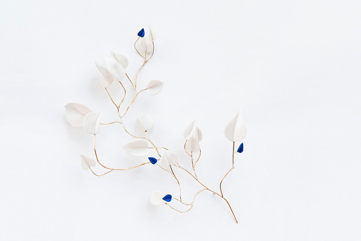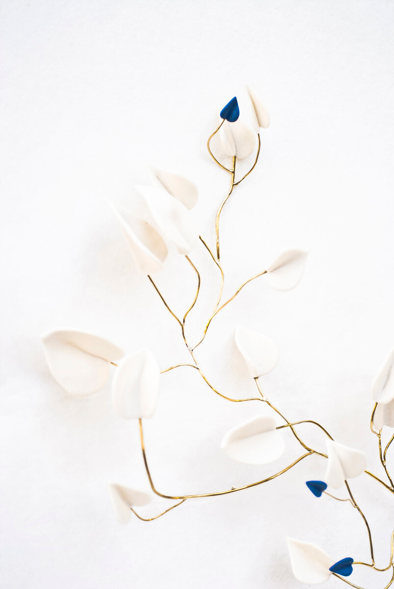 Les branches et feuilles en porcelaine, rehaussées de dorures et de laiton, font écho aux mycètes : la nature crée une infinité d’œuvres uniques et il n’existe pas deux feuilles ou branches identiques. La céramiste transforme une simple forme de cœur en feuilles toutes différentes et des tiges fines de laiton en variations uniques, qui mettent en lumière la beauté douce et inspirante de la nature.