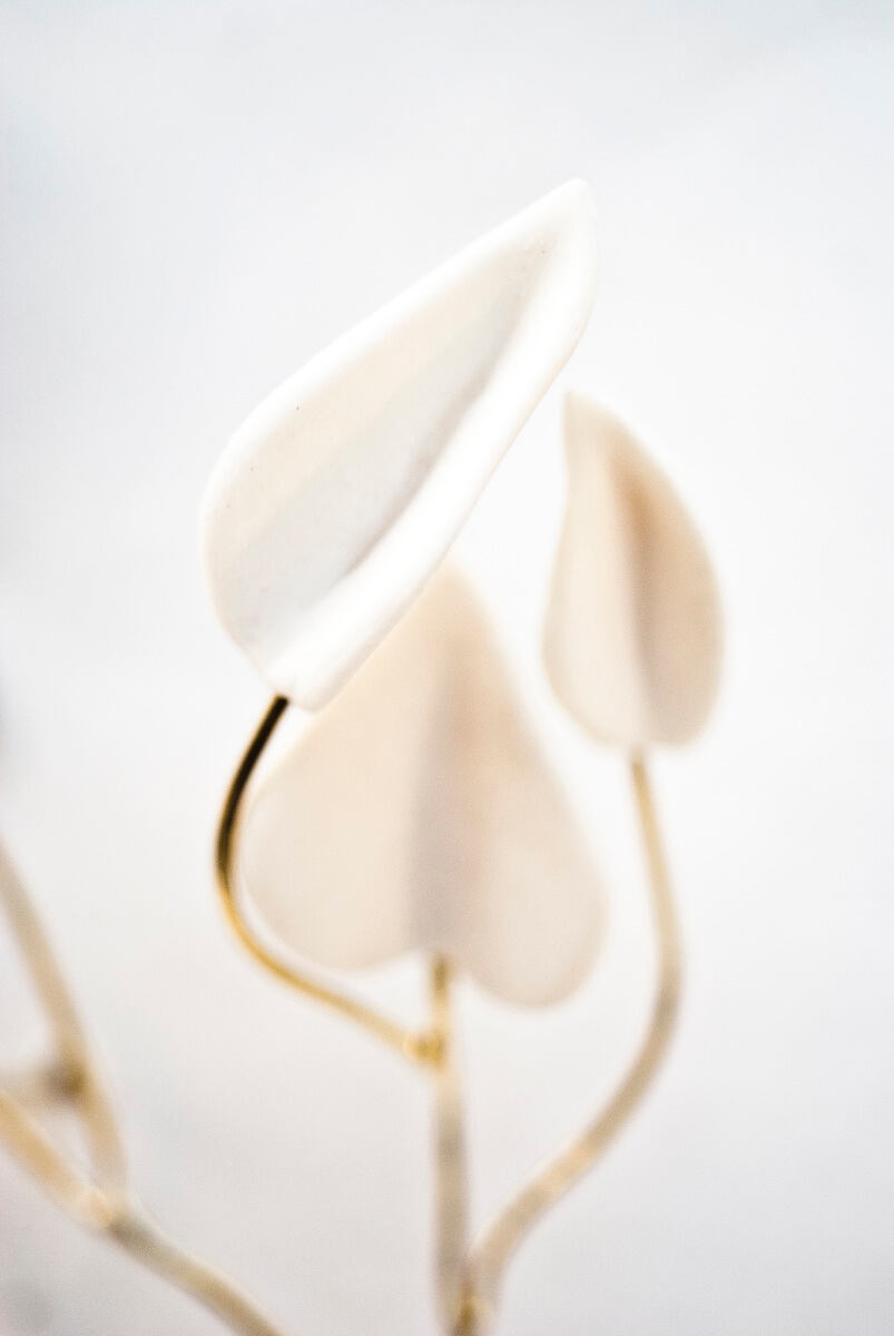 The porcelain branches and leaves, enhanced with gilding and brass, echo mycetes: nature creates an infinite number of unique works, and no two leaves or branches are ever identical. The ceramicist transforms a simple heart shape into leaves, each one different, and fine brass stems into unique variations that highlight the gentle, inspiring beauty of nature.